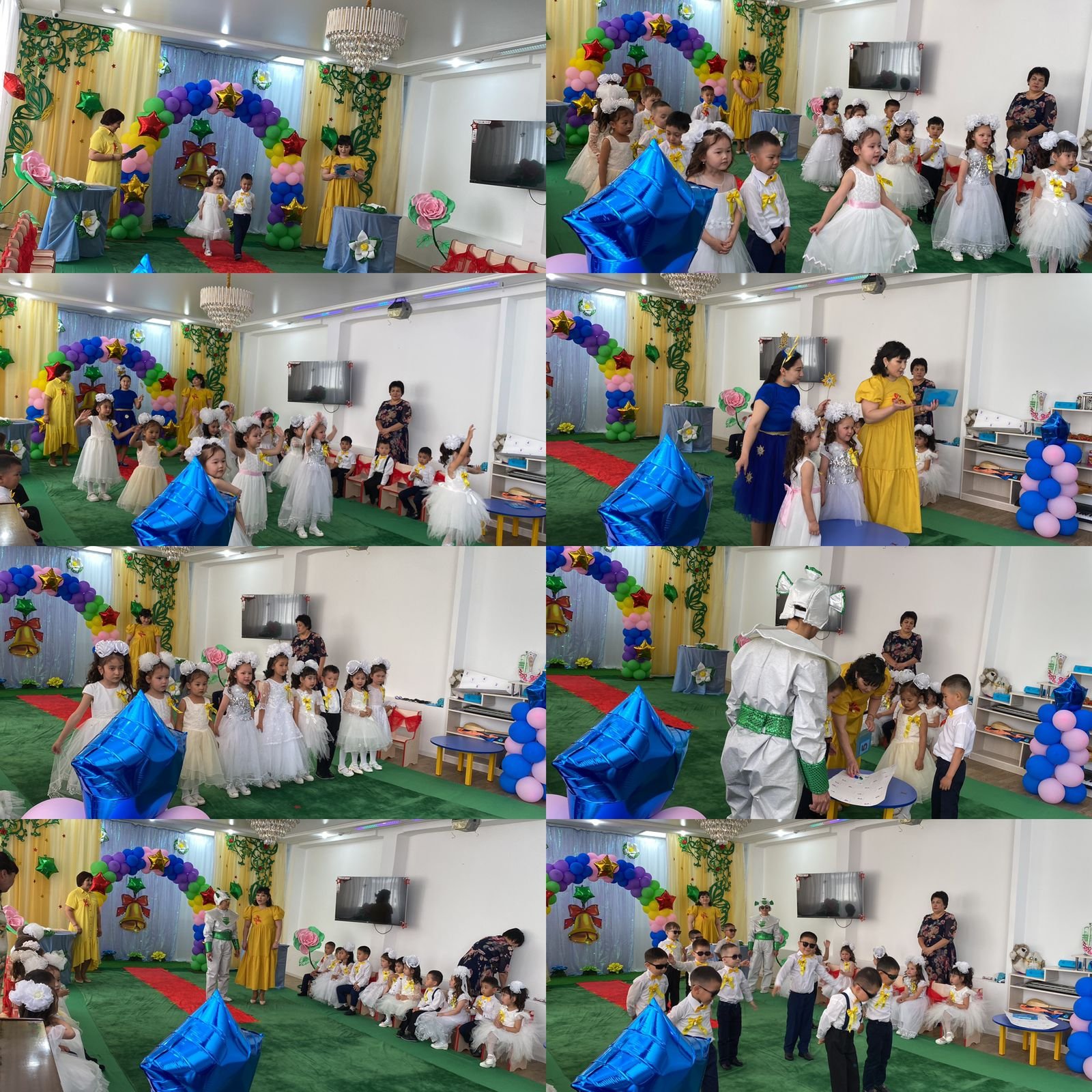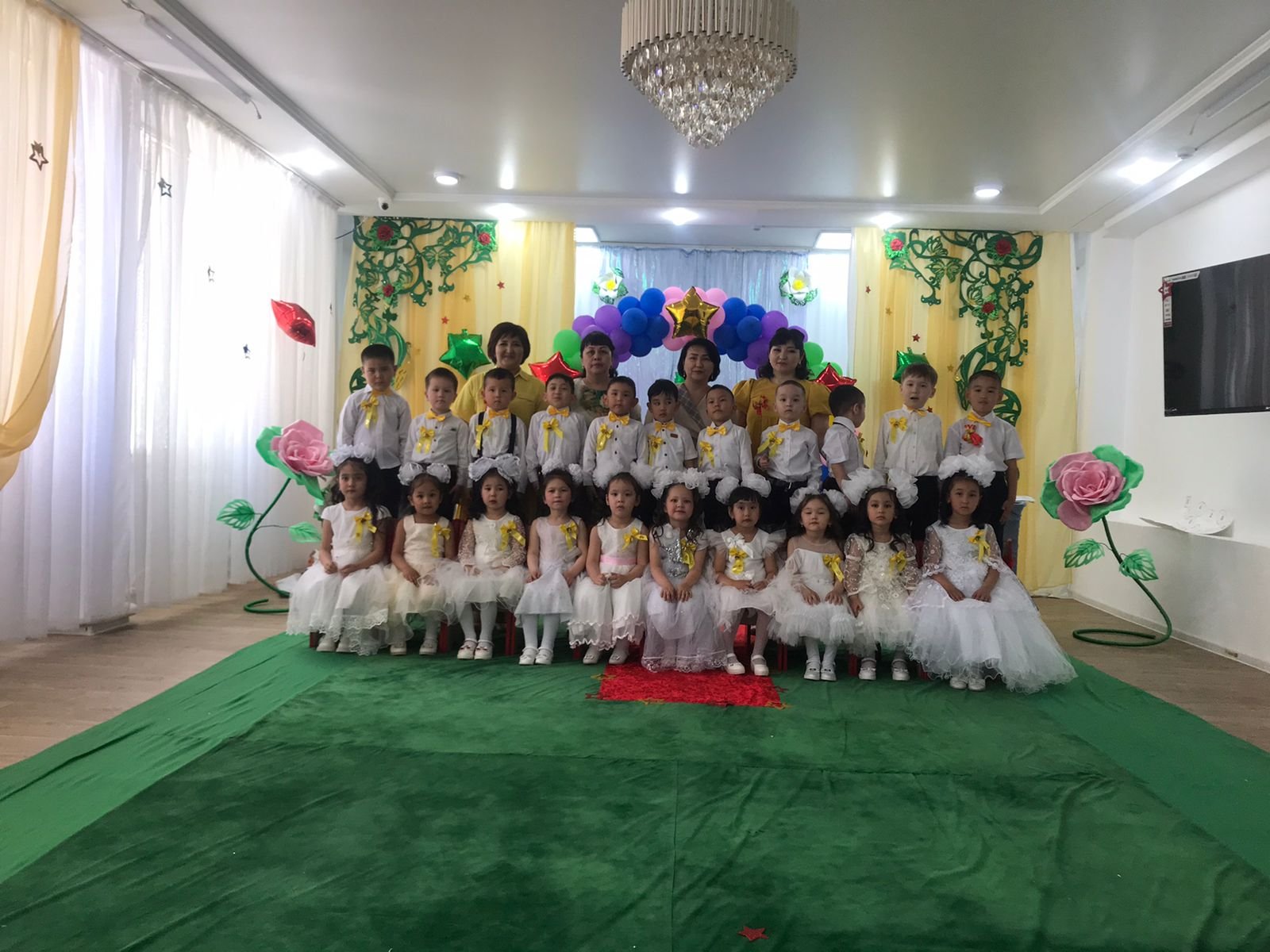 Мақсаты:Балалардың мерекелік көңіл-күйін қалыптастыру. Балабақша, мектеп туралы өлең шумақтарын, әндер айтқызу арқылы балалардың тілдерін дамыту. Көріністер арқылы мектепке дайындығын тексеру. Мектеп, оқуға деген қызығушылықтарын арттыру.
