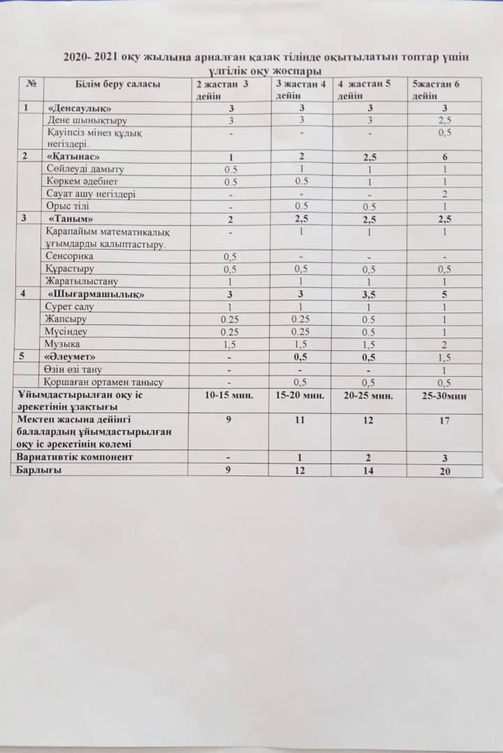 2021-2021 оқу жылына арналған қазақ тілінде оқытылатын топтар үшін үлгілік оқу жоспары