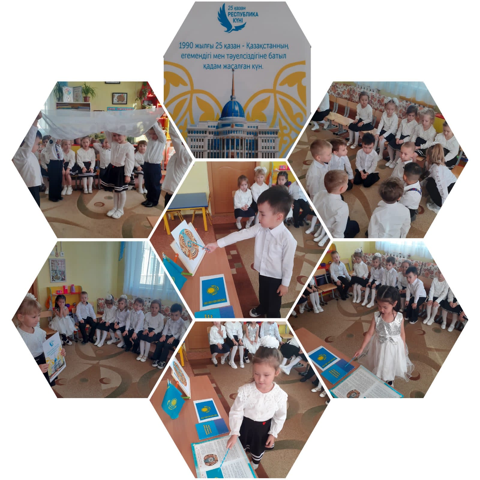 25 қазан Республика күніне арналған балалар шығармашылығының сурет көрмесі. Мақсаты: Балалардың ҚР жайында білімдерін кеңейту. Шығармашылықтарын дамыту. Туған елге, жерге деген сүйіспеншілікке тәрбиелеу.