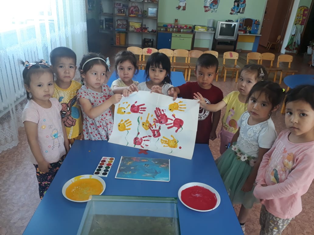Мақсаты: Сурет салудың дәстүрлі және дәстүрден тыс әдістері арқылы балалардың бейнелеу өнеріне деген қызығушылықтарын арттыру. Бейнені қағаз бетіне орналастыра білуін және шығармашылық қабілеттерін дамыту. Су асты тіршілік иелеріне деген сүйіспеншілік сезімін тәрбиелеу.