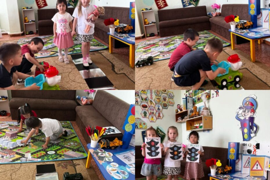 Мақсыты: тәрбиеленушілерді жолда жүру ережесімен және бағдаршам мен таныстыруды жалғастыру. Полиция қызметкерінің жұмысымен таныстыру. Көшеде жол ережесін сақтауға тәрбиелеу.