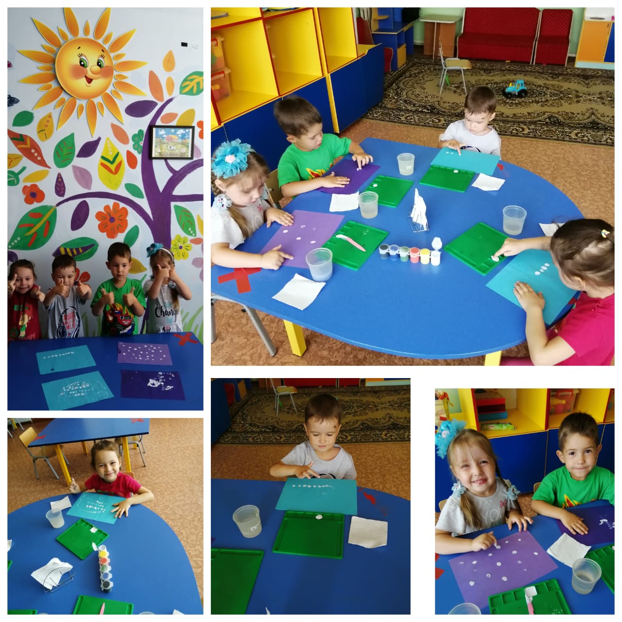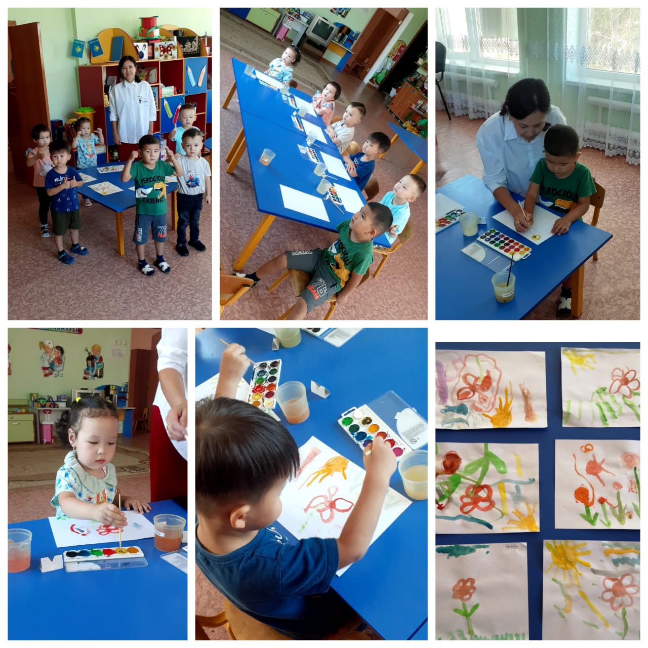 Мақсаты: Түрлі құралдармен, тәсілдермен таныстыру. Түстердің алуанлығын ұғыну. Дәстүрлі емес тәсілді пайдалану кезінде шығармашылығын дамыту. Ұжыммен жұмыс жасауды үйрету.
